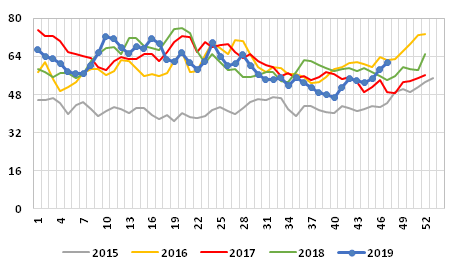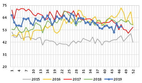Graph 1: Weekly average price of exports of fresh salmon, 2015/2019, in NOK/kg