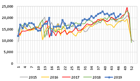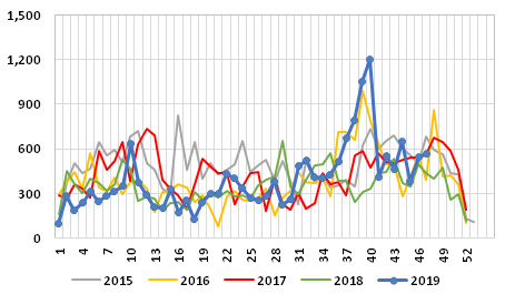 Graph 4: Weekly Norwegian exports of frozen salmon, 2015/2019, in tonnes