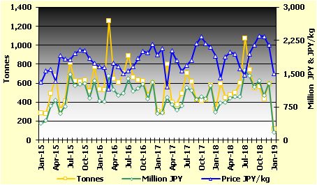 The average CIF price of fresh bluefin imported by Japan in January was JPY 1,504/kg, down 30% on that of December 2018 and 21% in value on that of January 2018.