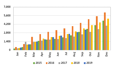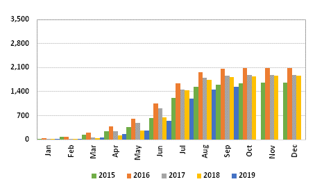 Graph 4: Imports of fresh southern bluefin, accumulated monthly, 2015/2019, in tonnes