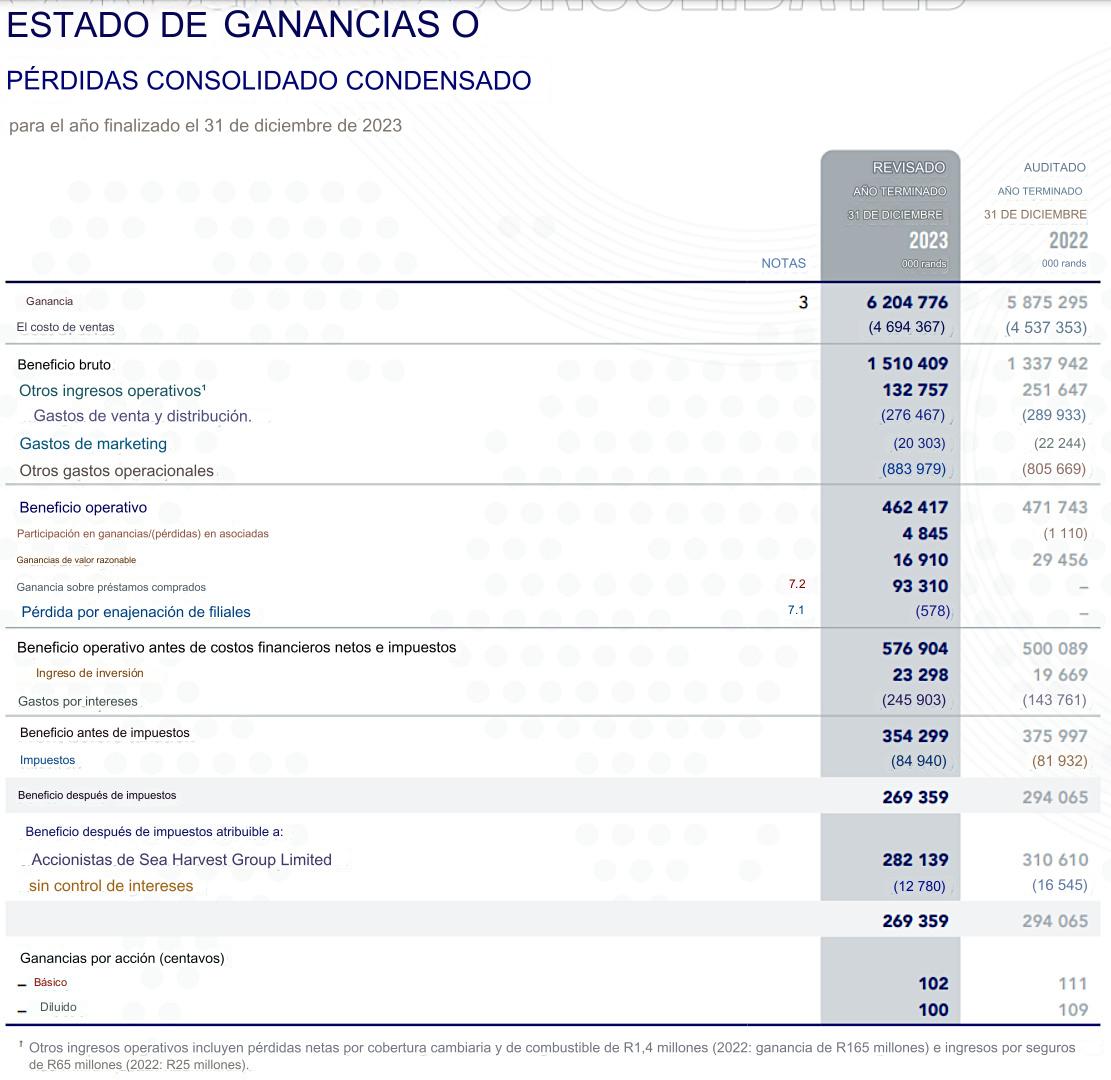 En un entorno difícil, Sea Harvest Group logró un desempeño operativo resistente para el año que finalizó el 31 de diciembre de 2023. El período experimentó una fuerte demanda de productos del mar a nivel internacional, compensada por las difíciles condiciones de pesca a nivel local, la persistente inflación de costos y el impacto continuo del desprendimiento de carga.