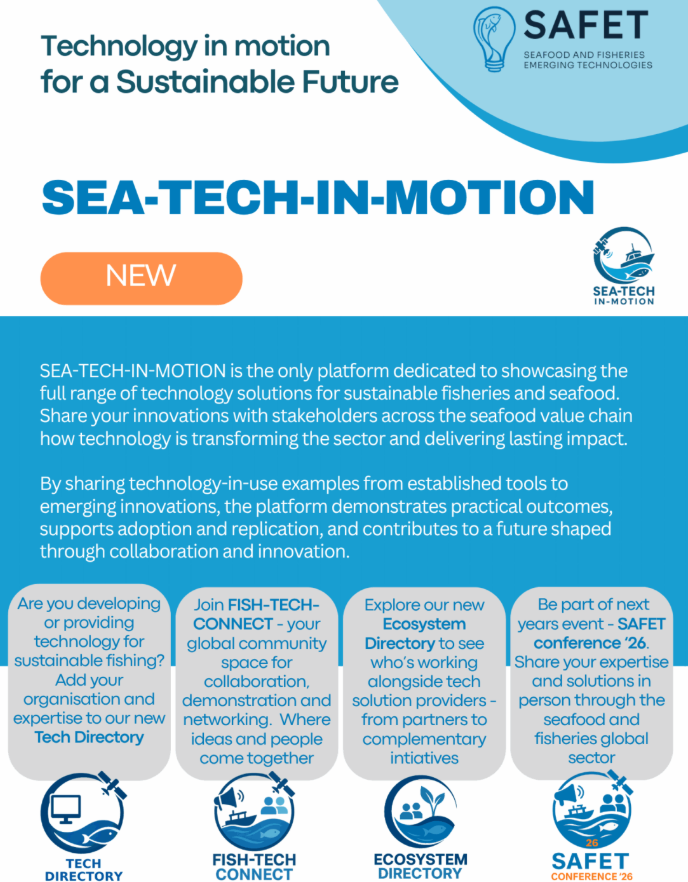 La base de datos complementaria de SAFET recién lanzada, SEA-TECH-IN-MOTION, muestra despliegues tecnológicos del mundo real e historias de éxito en el sector de la pesca y los productos del mar para concienciar y fortalecer la confianza en estas tecnologías.