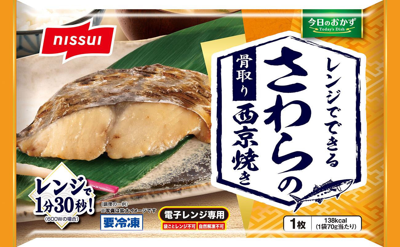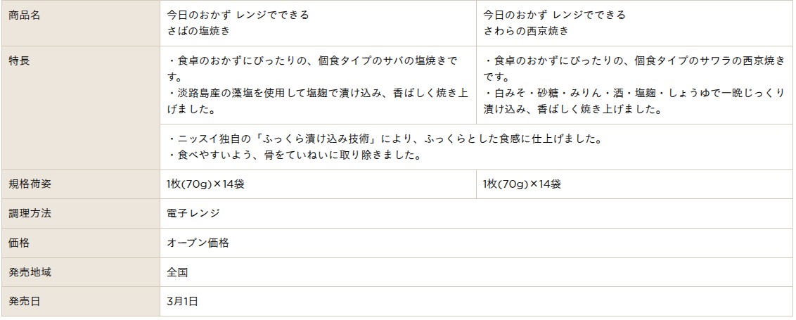 株式会社ニッスイ(代表取締役 社長執行役員 田中 輝、東京都港区)は、ご家庭の食卓に向けた惣菜を揃えた「今日のおかず」シリーズ(家庭用冷凍食品)の新商品として、「今日のおかず レンジでできる さばの塩焼き」「同 さわらの西京焼き」「同 あじの梅しそフライ」の3品を3月1日に発売します。人気の"焼き魚"や"魚のフライ"が、電子レンジであたためるだけで手軽に召しあがれる商品です。