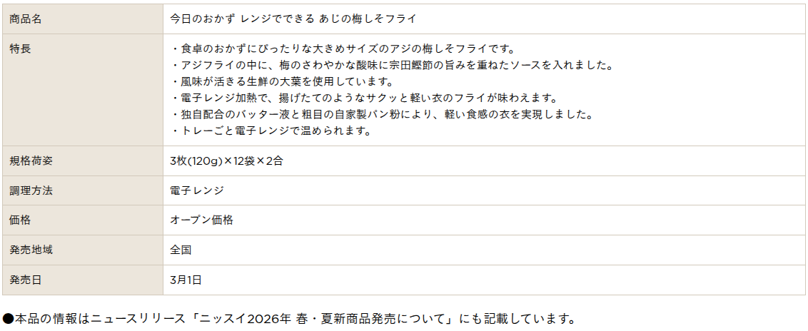 The new items are part of Nissui’s Spring/Summer 2026 product concept, titled “Working closely with customers to bring joy through new food.” The company says the products were developed to enrich everyday meals and deliver what it calls “soul-satisfying pleasure” at the dinner table, even on busy weekdays.