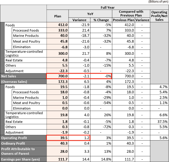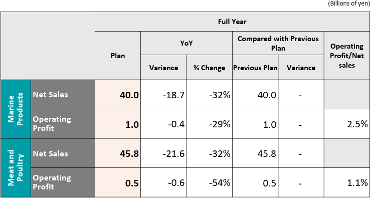 En el Negocio de Productos Marinos, las ventas disminuyeron debido a la reducción de productos de bajo margen, pero el beneficio operativo aumentó gracias a la expansión de las ventas de productos de alto valor añadido, como camarones y huevas de pescado. El Negocio de Carne y Aves registró una fuerte caída de las ventas durante el proceso de reformas estructurales, lo que dio lugar a una disminución del beneficio operativo de 400 millones de yenes.
