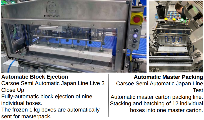 Carsoe Semi Automatic Japan Line Live 6. Weighout of 1 kg batches. Complete solution with automatic check-weighing and adjustment indicator.