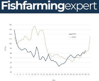 El precio spot promedio en lo que va de año es de 76,25 NOK/kg, en comparación con los 92,57 NOK del año anterior.