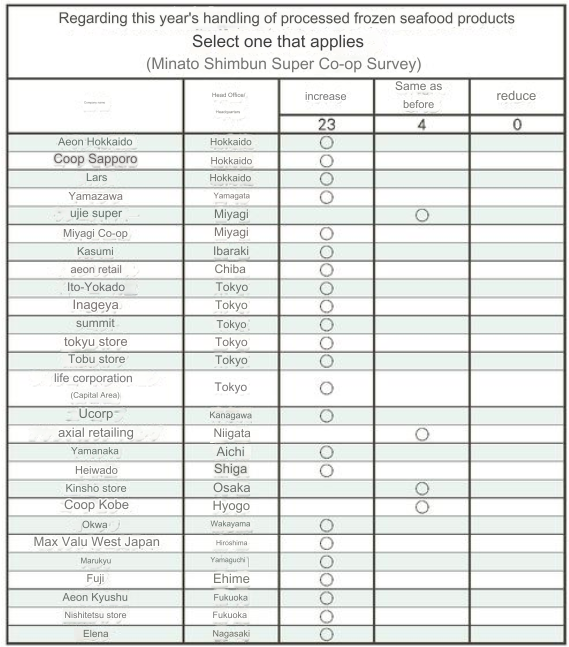 According to a survey conducted by the Minato Shimbun at the beginning of the year to a total of 27 leading supermarkets and consumer cooperatives nationwide (Life Corporation is only in the Tokyo metropolitan area), when asked about their intentions to handle frozen processed seafood products this year, all 27 responded.