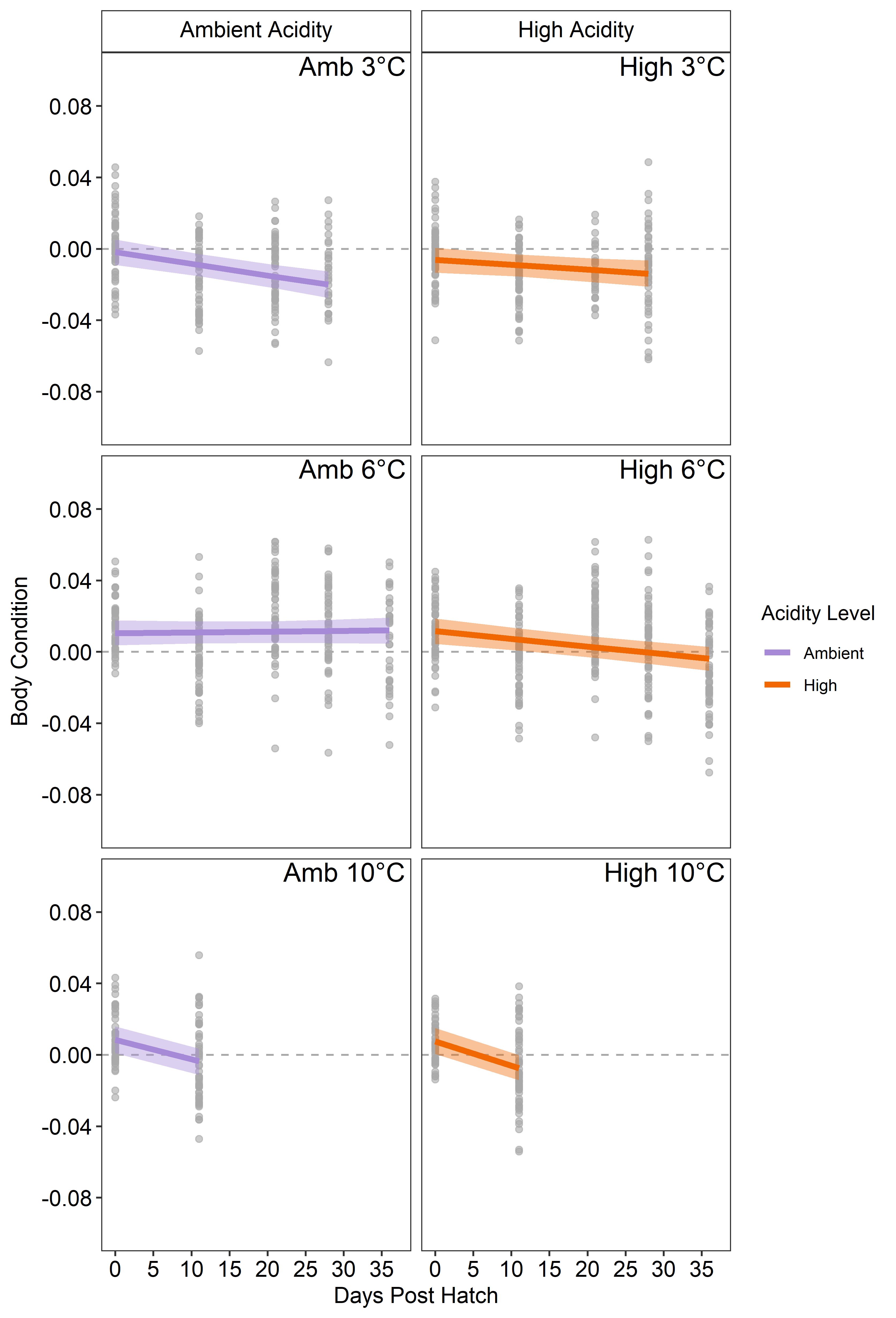 Body condition of larvae over time under different temperature and acidity combinations. Condition decreased rapidly in the warmest (10°C) treatment, leading to mortality and an early end to the experiment. Acidification affected larvae only at the optimum temperature of 6°C. Credit: NOAA Fisheries