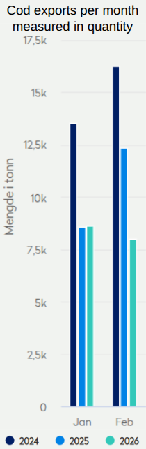 - Exports of quality-labelled skrei also declined in February.