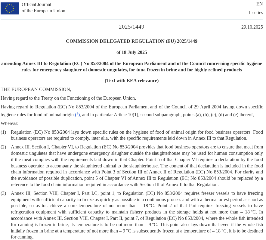 Under the newly issued Delegated Regulation (EU) 2025/1449, which amends Annex III of Regulation (EC) No. 853/2004, the bloc will enforce a uniform cooling standard for all tuna destined for the plates of European consumers.