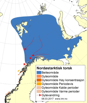 En este momento, millones de skrei sexualmente maduros migran desde el mar de Barents a la costa noruega para desovar. Son los afortunados ganadores de la lotería de la vida. (Mapa: Instituto de Investigación Marina).