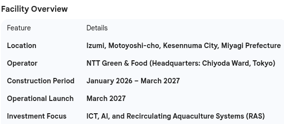 KESENNUMA, MIYAGI — On January 13, 2026, NTT Green & Food (NTTG&F) officially commenced construction on a state-of-the-art land-based aquaculture facility in the Koizumi district of Kesennuma City. The groundbreaking ceremony, attended by 89 officials including Kesennuma Mayor Shigeru Sugawara, marks a significant milestone for Japan’s "Blue Economy" and the digital transformation of the fishing industry.