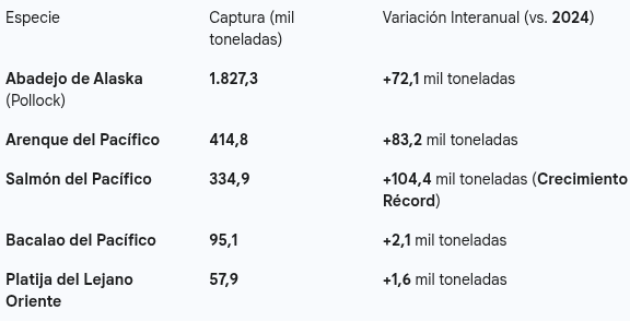 El fuerte aumento del Salmón del Pacífico ha sido un factor clave en la superación de las cifras de 2024, con Kamchatka liderando históricamente la captura de esta valiosa especie. Por su parte, el Abadejo de Alaska mantiene su posición estratégica como la pesquería más grande de Rusia y una de las más grandes del mundo.
