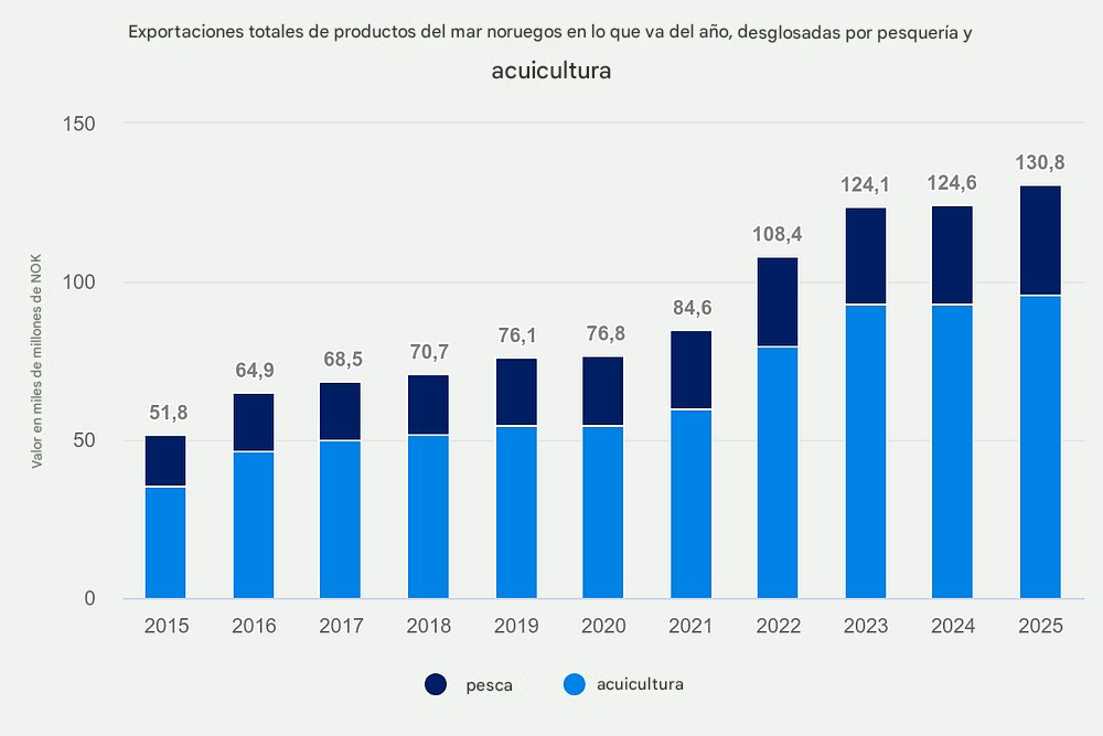 En lo que va del año, Noruega ha exportado productos del mar por un total de 130.8 mil millones NOK (aproximadamente $13.1 mil millones de dólares), un aumento del 5% con respecto al año pasado.