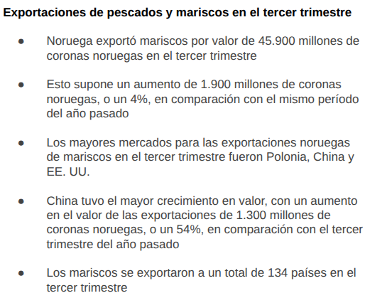 "Las exportaciones de productos del mar han tenido un mes fuerte en términos de valor y un sólido tercer trimestre. Esto se debe principalmente a los precios más altos de la caballa, el bacalao, el abadejo y el cangrejo real", declaró Christian Chramer, director ejecutivo del Consejo Noruego de Productos del Mar.