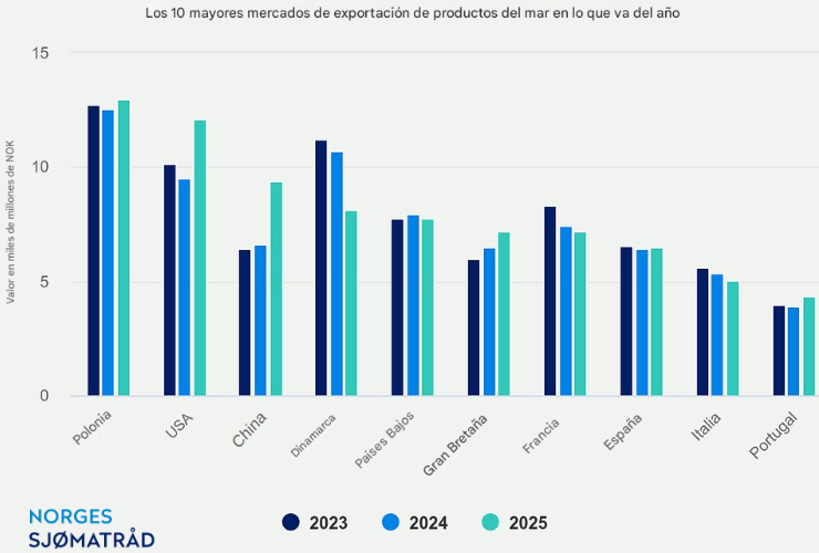 El fuerte desempeño en el tercer trimestre confirma esta tendencia. El total exportado en el tercer trimestre fue de 45.9 mil millones NOK (aproximadamente $4.6 mil millones de dólares), un aumento de 1.9 mil millones NOK (4%) respecto al año anterior. China registró el mayor crecimiento en valor trimestral, un aumento de 1.3 mil millones NOK, o 54%, en comparación con el tercer trimestre del año pasado.