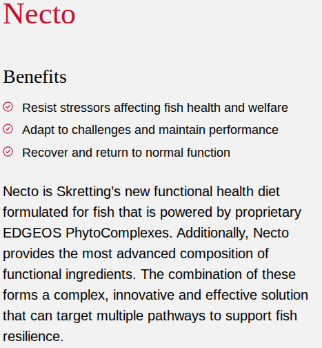 Necto is the result of a vast collaborative effort involving nine different research partners spanning five different countries. Independent third-party studies consistently demonstrated that the feed supported fish health and welfare, resulting in higher survival rates across several fish species.