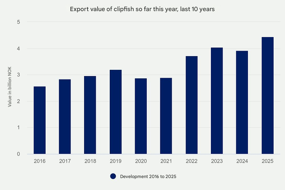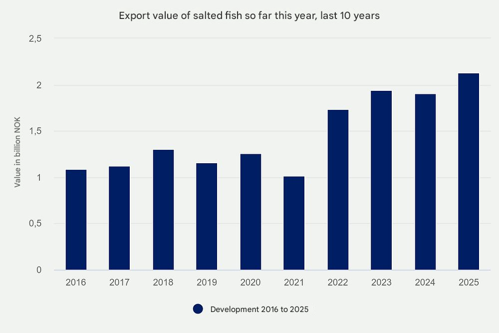 Portugal Dominates: Norway exported 1,600 tonnes of salted fish worth NOK 186 million (up 27% in value). Portugal saw the greatest value growth (up 47%), receiving 91% of all salted cod exports this year—the highest proportion ever.