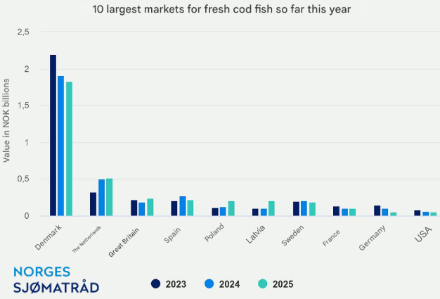Markets and Price: Denmark, the Netherlands, and Poland were the largest markets. The price level remains significantly higher than last year, with fresh whole wild cod at NOK 72 per kilo (up 13%) and fresh whole farmed cod at NOK 70 per kilo (up 17%).