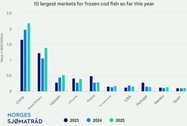 Historical Shift: For the first time, Vietnam is Norway's largest market for frozen cod, driven by an export value increase of 245% (NOK 40 million). This shift is attributed to Vietnam facing a lower tariff rate than China when re-exporting frozen cod fillets to the US.