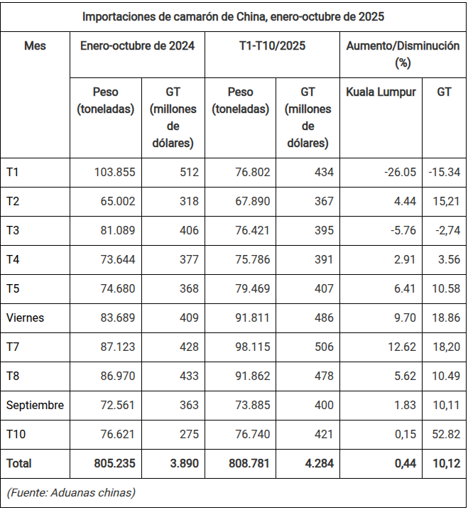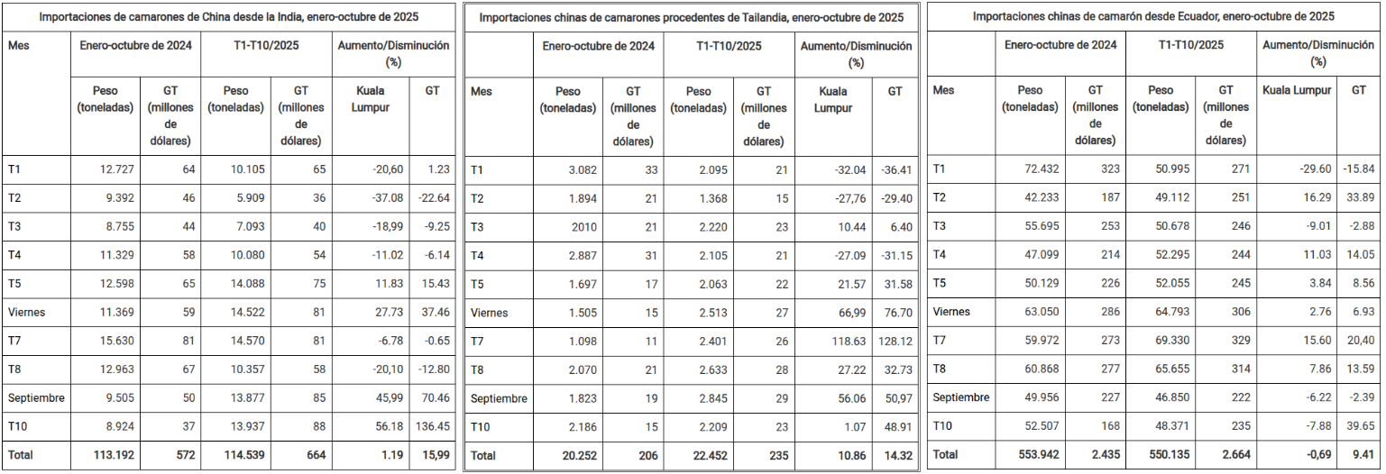 Importaciones de camarón de China desde India, Tailandia y Ecuador, enero-octubre de 2025. Haga clic sobre la imagen para ampliarla