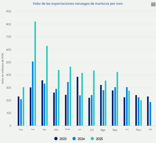 • El Reino Unido fue el mercado más grande en noviembre, representando el mayor crecimiento de valor con un volumen de exportación de 4 toneladas, valorado en aproximadamente $104,500 (NOK 1.1 millones).