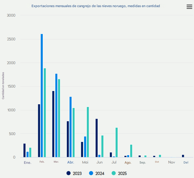 Noruega exportó solo 5 toneladas de cangrejo de nieve (snow crab), valoradas en aproximadamente $95,000 (NOK 1 millón), en noviembre.