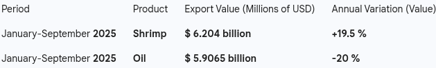 Growth Contrast: While shrimp experienced growth of 19.5 % in value and 13.6 % in volume compared to 2024, FOB revenues from oil fell by 20 %, with an 8.4 % decrease in exported volume.
