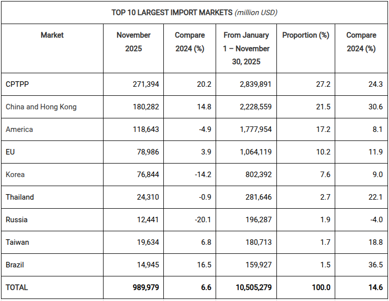 The CPTPP market became the largest export destination, accounting for 27.2% of the total and seeing a sharp increase of 24.3%. Exports to China - Hong Kong soared by 30.6%, and the EU market grew by 11.9%.