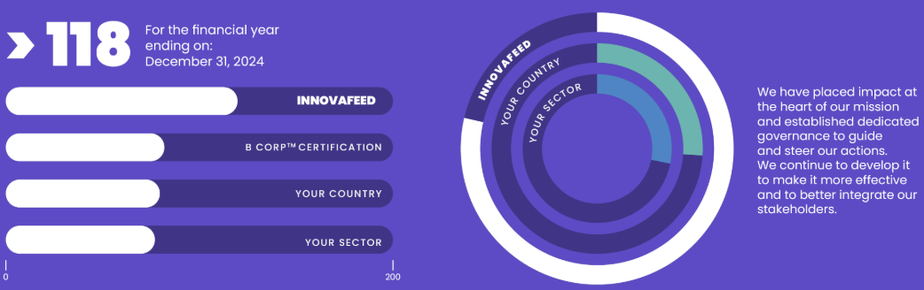 In 2025, Innovafeed achieved an overall score of 118 out of 200, a significant improvement over its initial score of 111. This progression reflects the company's growing maturity in integrating impact at the core of its business model and governance.