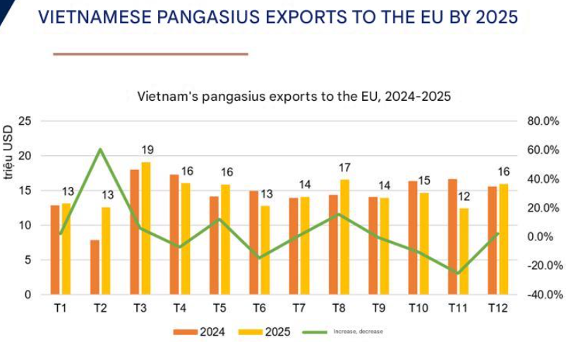 Focusing specifically on 2025, pangasius exports to the EU reached their annual peak in March, which posted the highest export value of the year and exceeded the same period in 2024. In addition, August and December also recorded relatively strong export values, suggesting that import demand tends to rise during peak consumption periods and toward year-end.