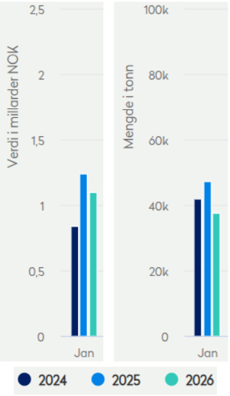 En enero, Noruega exportó 27.255 toneladas de arenque, por un valor total de 574 millones de coronas noruegas (NOK). Esto supone un aumento de 140 millones de NOK, o un 32 %, en comparación con el mismo mes del año pasado. El volumen exportado también aumentó de forma significativa, con un incremento interanual del 31 %.