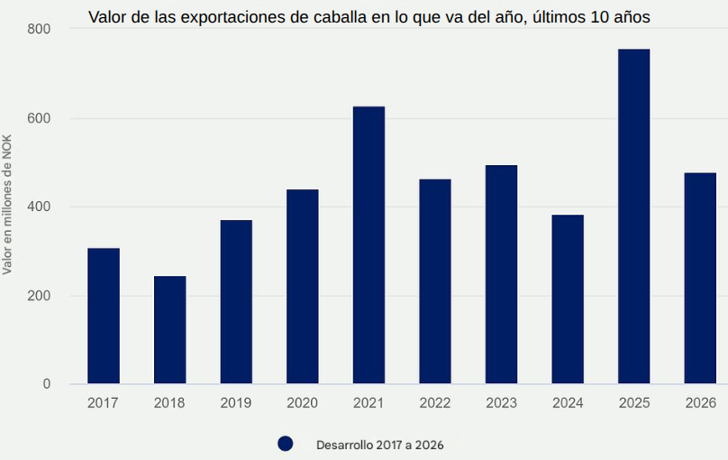 En contraste, las exportaciones de caballa registraron una fuerte caída en enero. Noruega exportó 9.086 toneladas de caballa, con un valor de 478 millones de NOK. Esto supone una disminución de 280 millones de NOK, o un 37 %, en comparación con enero del año pasado. El volumen exportado cayó de forma drástica, con un descenso del 63 %.