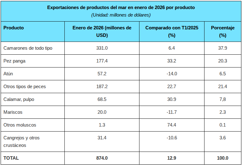 Las exportaciones vietnamitas de productos del mar registraron un sólido inicio en 2026, al alcanzar aproximadamente US$874 millones en enero, un aumento cercano al 13% en comparación con el mismo período de 2025. Este incremento refleja los esfuerzos de las empresas por asegurar pedidos a comienzos de año, aun cuando el comercio mundial de productos del mar sigue enfrentando una creciente presión por barreras técnicas, medidas arancelarias y regulaciones más estrictas en mercados clave.