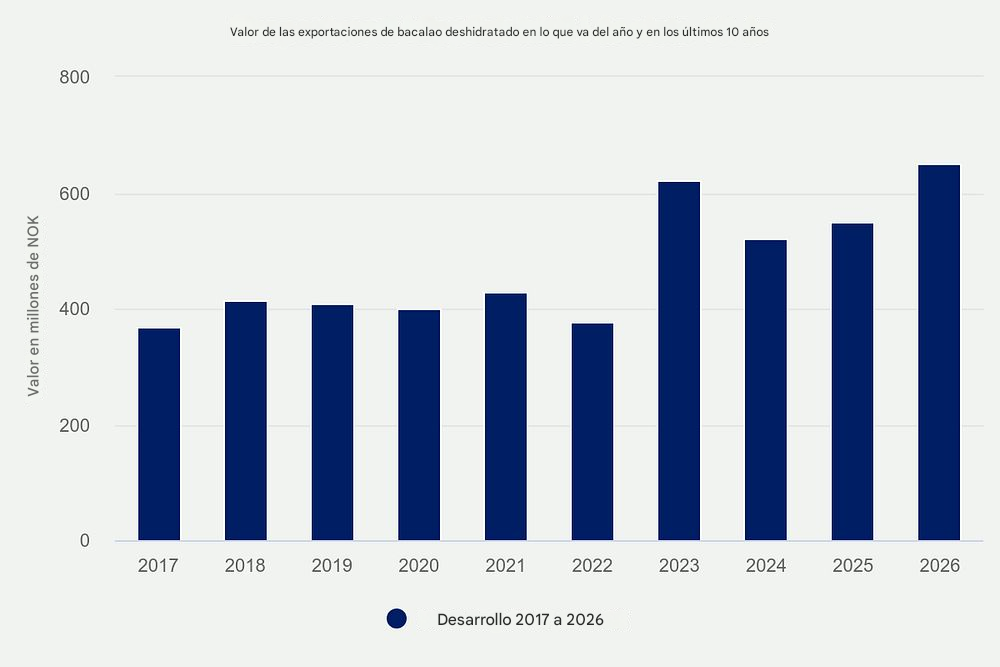 - Noruega exportó 6.643 toneladas de bacalao salado seco (clipfish) por un valor de USD 67,0 millones ( NOK 649 millones ) en enero .