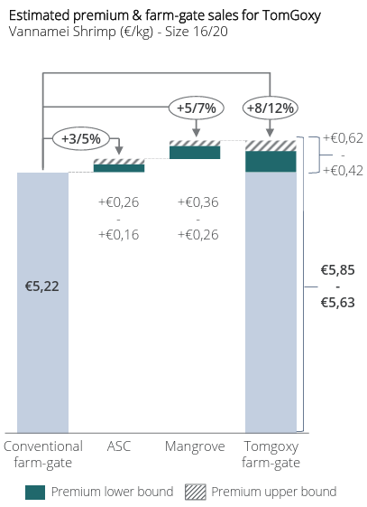 El modelo TomGoxy Zero proyecta en su primera etapa una producción de aproximadamente 400 toneladas métricas (MT) de camarón al año en dos granjas. Este volumen es demasiado pequeño para que los grandes minoristas desarrollen un surtido de marca propio o mantengan entregas estables cada semana.