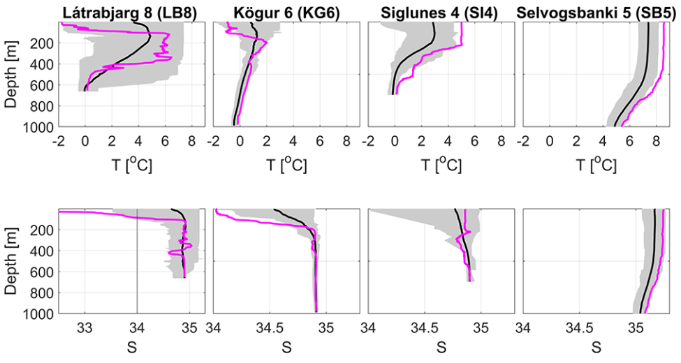 Temperature (upper panel) and salinity (lower panel) profiles at four different stations collected during the February 2026 cruise (magenta), compared with the long-term winter mean profiles (black). Grey shading indicates the historical range of observed winter values 1970 – 2025. Note that the temperature at Siglunes 4 and Selvogsbanki 5 is higher than ever before, while at Látrabjarg 8 and Kögur 6, near-surface water is extremely cold and fresh. Note the different salinity scale at LB8. Source: Hafrannsóknastofnun. Click on the image to enlarge it