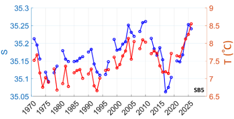 At the outermost monitoring stations LB8 and KG6, located within the East Greenland Current, researchers recorded extremely low temperatures and record-low salinity. These waters are strongly influenced by melting Arctic ice, which freshens and cools the ocean.
