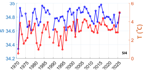 Temperature (red) and salinity (blue) at Siglunes 4 from winter surveys 1970 – 2026 (0 – 200 m depth averages), showing the record heat in February 2026. Source: Hafrannsóknastofnun