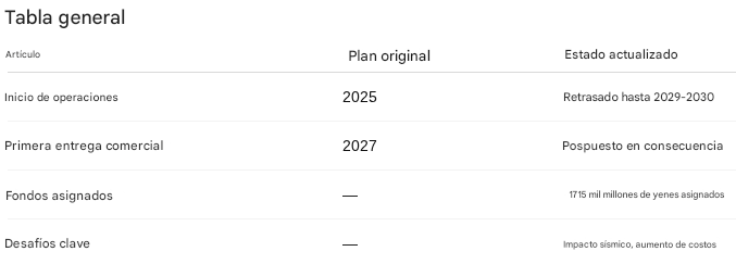 Si bien los informes iniciales proyectaban que la instalación estaría operativa en 2025 con la primera entrega comercial en 2027, el nuevo plan apunta al primer envío para el año fiscal 2029 (que finaliza en marzo de 2030). Los retrasos se atribuyen a desafíos imprevistos, incluido el impacto de un terremoto reciente y el aumento de los costos de construcción. A pesar de los contratiempos, el proyecto avanza con financiación asegurada, incluida una asignación de 11,66 millones de dólares.