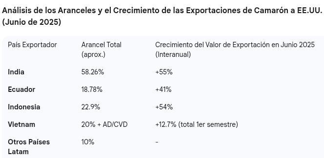 La nueva estructura arancelaria ha alterado profundamente la dinámica competitiva entre los principales proveedores de camarón. La India, el mayor exportador a EE.UU., es el más afectado. Al enfrentarse a un arancel total potencial de hasta el 58.26% (incluidos los aranceles antidumping y antisubvención), el camarón indio se está volviendo menos competitivo. Mientras tanto, Ecuador ha obtenido una clara ventaja arancelaria con un arancel total de solo el 18.78%, lo que impulsa un rápido aumento en sus exportaciones de camarón pelado y productos de valor agregado. Indonesia, a pesar de un fuerte aumento en junio, está sujeta a un impuesto total del 22.9%, lo que lleva a su industria a considerar cambiar el enfoque hacia el mercado chino.