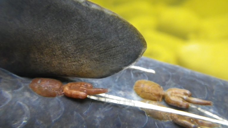 Piojo de salmón hembra adulto con cuerdas de huevos en salmón salvaje. Foto: Ketil Skår, Instituto Veterinario Noruego