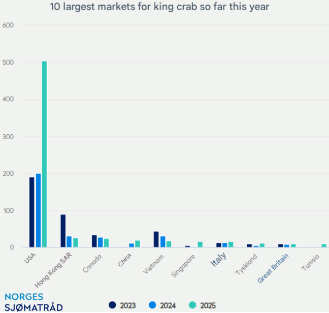 EE. UU. experimentó el mayor crecimiento en valor, con un aumento en las exportaciones de 57 millones de NOK (aprox. $5.43M), o un 238%, en comparación con el mismo mes del año pasado. El volumen de exportación a EE. UU. alcanzó las 116 toneladas, un 161% más que en julio del año anterior.