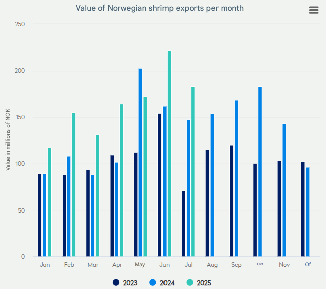 - Noruega exportó 3,482 toneladas de camarón de aguas frías con un valor de 183 millones de NOK (aprox. $17.43M) en julio.