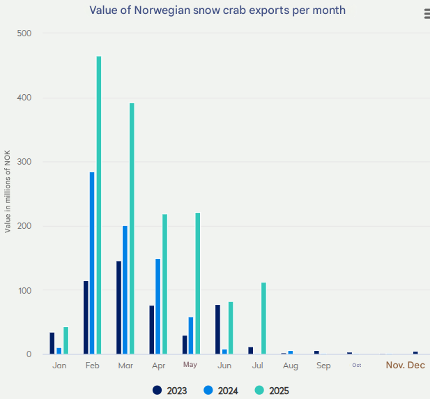 - Noruega exportó 630 toneladas de cangrejo de las nieves con un valor de 112 millones de NOK (aprox. $10.67M) en julio.